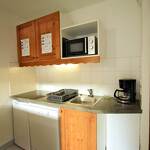 Coin cuisine : plaques vitrocéramique, four micro-ondes, réfrigérateur, lave-vaisselle et tout le nécessaire de vaisselle